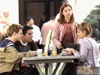 Draußen an einem Picknicktisch. Oz, Xander, Willow und Buffy sind beim Essen.